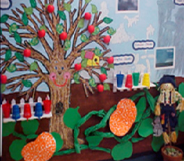 I got the idea of playing with flashcards from my first grade teacher, Mrs. Jenkins. I especially remember hanging the flash card ornaments on a shiny paper Christmas tree. I always like to have a tree in my classroom that changes with the seasons. It is either painted onto a bulletin board, made out of twisted paper, or composed of real branches sitting in plaster in a paper bucket. This gives me a place to hang the flashcards we are currently working on. (In the image above the apples could have items written on them.) Of course, you can just hang the cards on the classroom wall. Use pins or hooks so the students can take them down and put them up.