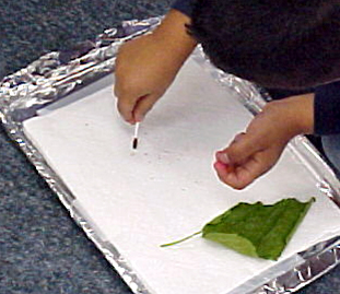 - Each day have a couple of students clean the tray and feed the larvae. Move the leaves onto the table, and replace the paper towel. Fold the corners of the paper towel in toward the middle to collect all the dung, fold it all up, and put the paper towel a trashcan. It is not very messy. Then put the old leaves, with the larvae on them, back onto the fresh towel. Put the fresh leaves on top of the dry leaves, and the larvae will climb onto the new leaves. Leave the old leaves in the tray until you are SURE there are no caterpillars on them. If you have to remove tiny hatchlings from the old dead leaves, use a watercolor paintbrush.