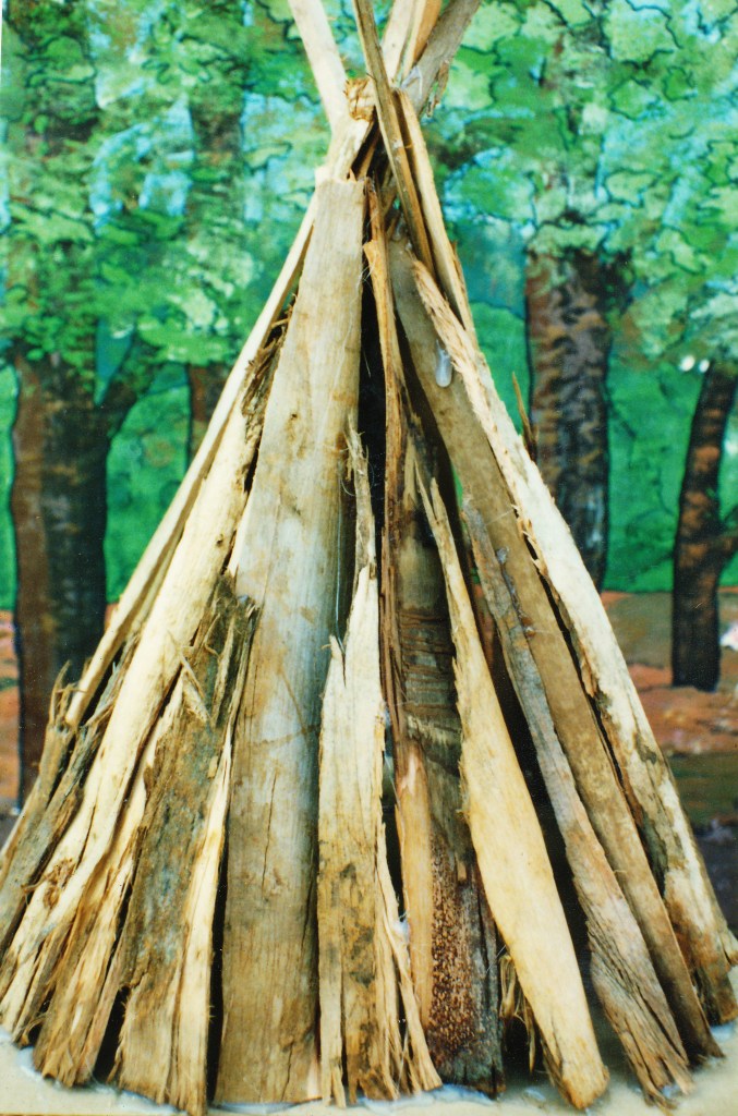 | The background is a mural painted by third and fourth graders. The foreground is a student made plank wickiup representative of native Californians in woodland regions. |