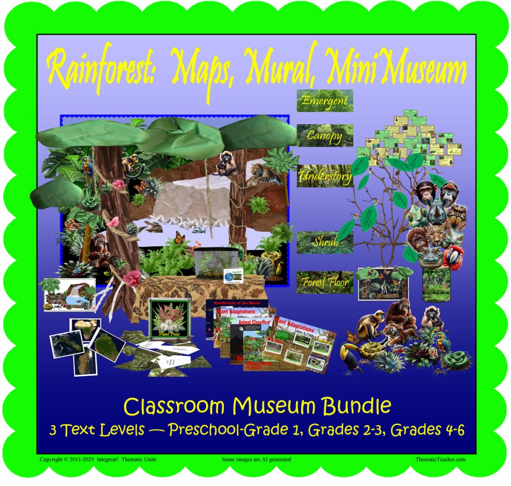 Build a rainforest–right in your own classroom–using butcher paper, construction paper, cutouts (included), and silk plants. The mural directions include information for creating a stage backdrop. Individual items are also available separately.
