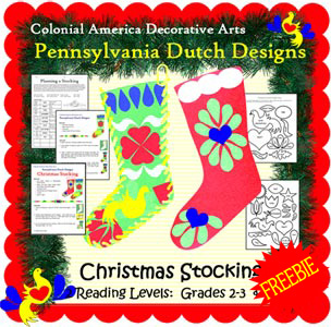 The colorful, beautiful, and symbolic motifs used in the artwork of the Pennsylvania Dutch make lovely cards and Christmas stockings. Two sets of materials include “Read and Follow Directions” worksheets that walk students through making a cut-and-paste Christmas stocking in the Pennsylvania Dutch genre.